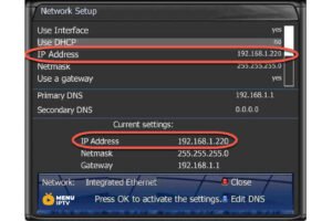 Step 2: To connect, we need to know the box IP address, username, and password (username and password usually is root/root). Now about the IP, click the Menu button on the remote controller. Go to Setting then Network Settings. You should see something like the below image: